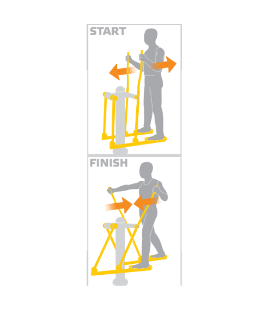 Treniruoklis skirtas pečių, kojų ir sėdmenų raumenų grupėms stiprinti, padedant palaikyti bendrą kūno tonusą ir fizinę ištvermę.