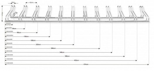 optimalus pozicijų atstumas (42 cm) leidžia saugiai pastatyti dviračius, nepaisant jų dydžio ir tipo