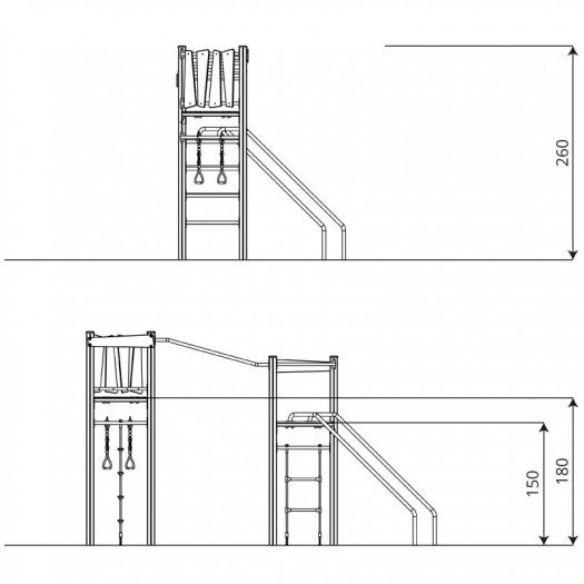 Vaikų žaidimų aikštelių įranga, pagaminta iš perdirbtos, drėgmei ir šalčiui atsparios kompozitinės medžiagos. Konstrukcijoje naudojamos neslystančios HPL plokštės, cinkuoto ir dažyto plieno platformos bei polipropileno dangteliai. Saugūs varžtai yra padengti plastiku. Įranga skirta viešosioms žaidimų aikštelėms, turi atitikties sertifikatą ir atitinka EN 1176-1:2017+A1:2023 standartą.