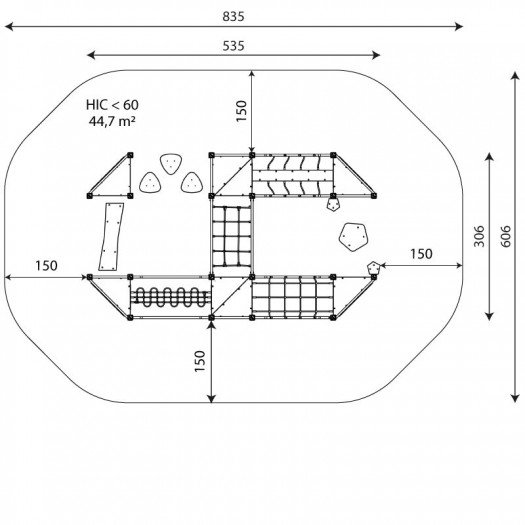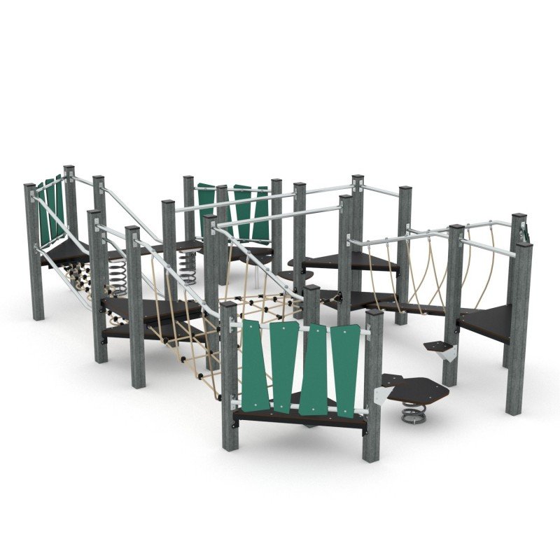 Konstrukcija sukurta iš perdirbtų, drėgmei ir temperatūrai atsparių medžiagų. Naudojamos HDPE plokštės ir polipropileno lynai su nerūdijančio plieno jungtimis. Įranga skirta viešosioms žaidimų aikštelėms ir atitinka EN 1176-1:2017+A1:2023 standartą. Užtikrintas saugumas, nėra aštrių briaunų ar pavojingų angų, apsaugo pirštus nuo įstrigimo.