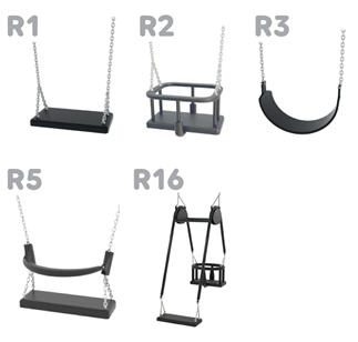 Galimi sūpynių sėdynių tipai: R1 – plokščia, R2 – krepšys, R3 – plokščia su diržu, R5 – plokščia su apsauginiu barjeru.