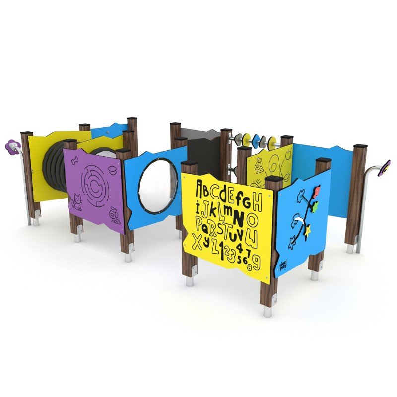 Edukacinės plokštės ir judantys elementai, pagaminti iš HDPE arba HPL plokštės, atsparios oro sąlygoms;