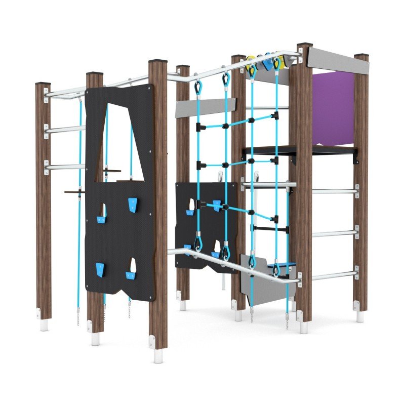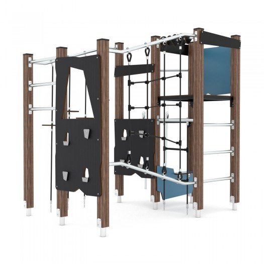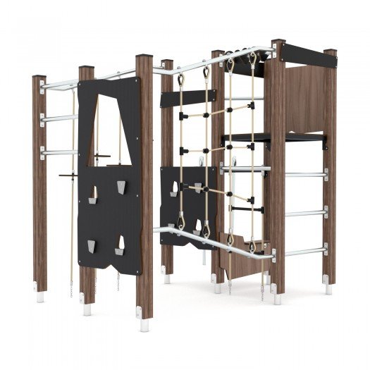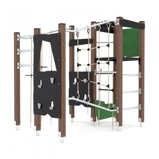 Kompleksas, pagamintas iš aukštos kokybės impregnuotos pušies medienos ir nerūdijančio plieno, pritaikytas vaikams nuo 3 iki 14 metų. Konstrukcija yra saugi, atspari aplinkos poveikiui, neturi aštrių briaunų ir atitinka EN 1176-1:2017+A1:2023 standartą. Įrenginyje telpa iki 17 vaikų, jo apsaugos zona yra 29,9 m², o kritinis kritimo aukštis – 220 cm. Kompleksui suteikiama garantija.