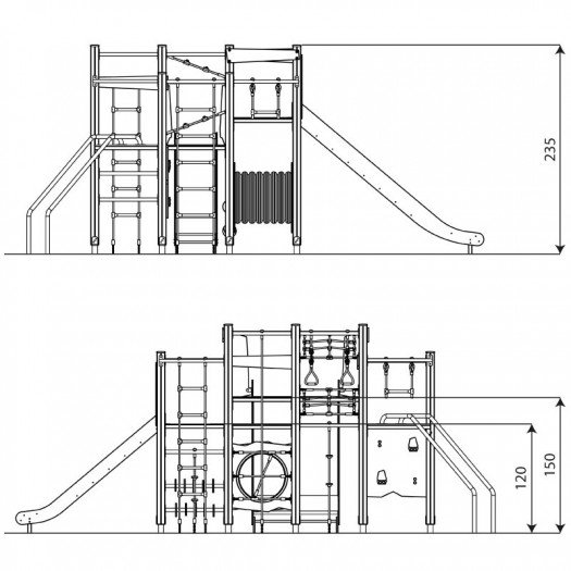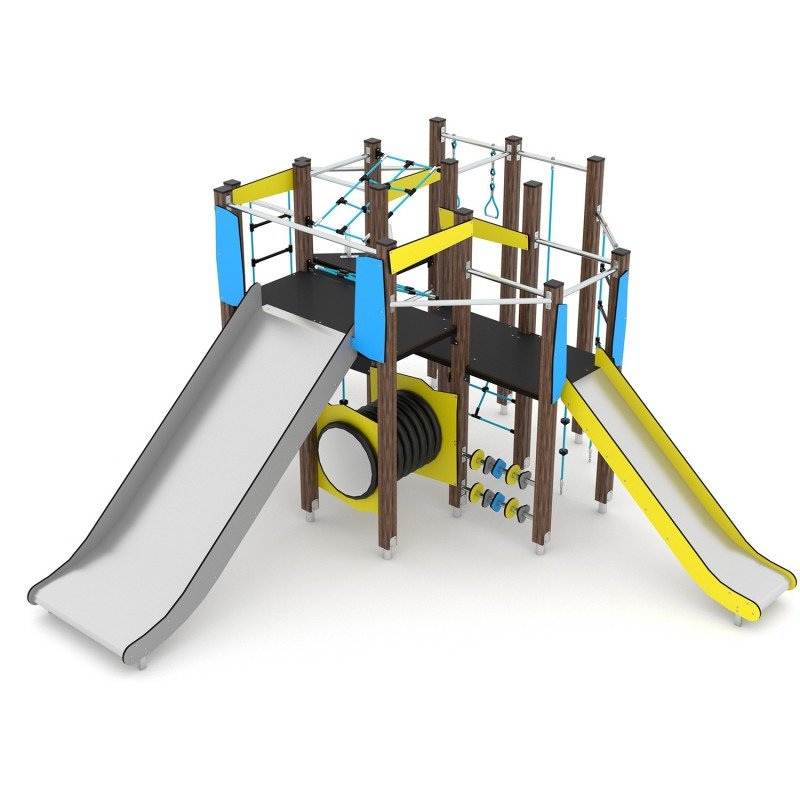 Aukštos kokybės žaidimų aikštelių įranga, pagaminta iš impregnuotos, laminuotos pušies medienos su cinkuoto plieno detalėmis. HDPE plokštės ir nerūdijančio plieno komponentai atsparūs oro sąlygoms. Skirta vaikams iki 16 metų, pritaikyta neįgaliesiems. Įranga skirta viešosioms žaidimų aikštelėms. Užtikrintas saugumas, nėra aštrių briaunų ar pavojingų angų, apsaugota nuo pirštų įstrigimo. Montavimas ant lygaus paviršiaus, 80/70/60 cm gylyje. Produktas sertifikuotas pagal EN 1176-1:2017+A1:2023 standartą. Suteikiama garantija.