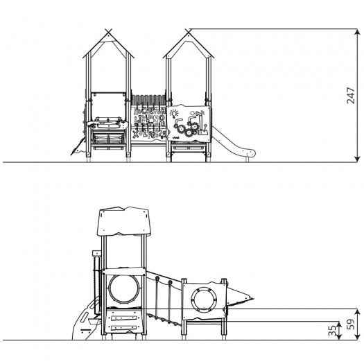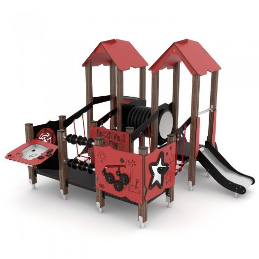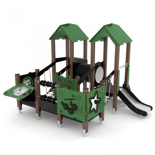 Aukštos kokybės vaikų žaidimų įranga iš laminuotos, impregnuotos pušies ir cinkuoto plieno, su neslidžiomis platformomis ir patvariais HDPE bei HPL komponentais. Konstrukcija pritaikyta vaikams su negalia, skirta viešosioms žaidimų aikštelėms. Atitinka EN 1176-1:2017+A1:2023 standartą, saugi naudoti, su apsauga nuo korozijos ir puvimo.