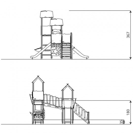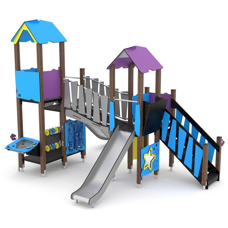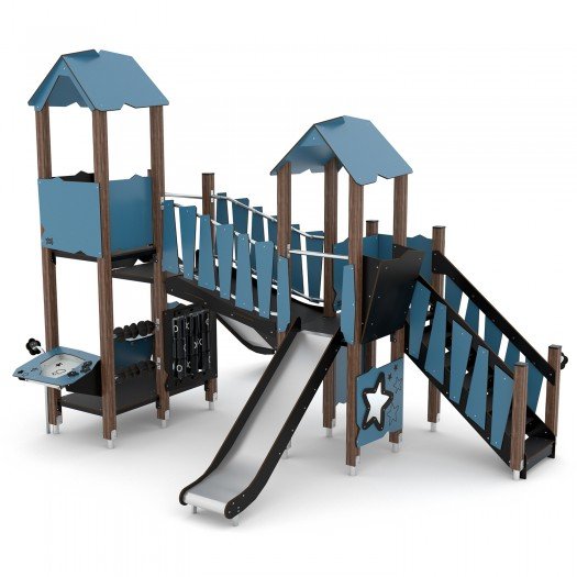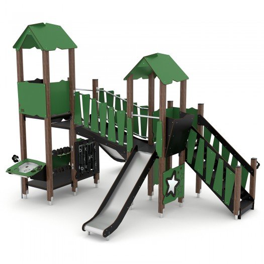 Aukštos kokybės vaikų žaidimų įranga iš laminuotos, impregnuotos pušies ir cinkuoto plieno, su neslidžiomis platformomis ir patvariais HDPE bei HPL komponentais. Konstrukcija pritaikyta vaikams su negalia, skirta viešosioms žaidimų aikštelėms. Atitinka EN 1176-1:2017+A1:2023 standartą, saugi naudoti, su apsauga nuo korozijos ir puvimo.