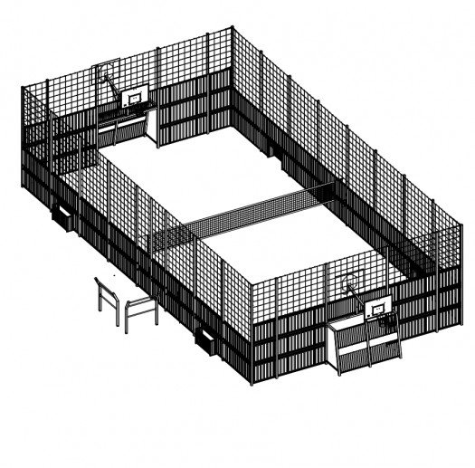 Vartai pagaminti iš karštai cinkuoto plieno ir HDPE plokštės, atsparios oro sąlygoms; Krepšiai pagaminti iš karštai cinkuoto plieno, lentos – iš HDPE;