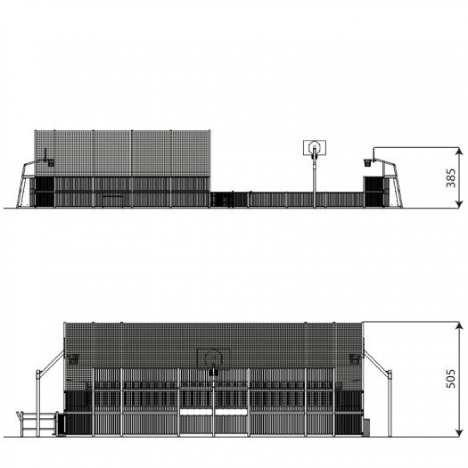 Vartai pagaminti iš karštai cinkuoto plieno ir HDPE plokštės, atsparios oro sąlygoms; Krepšiai pagaminti iš karštai cinkuoto plieno, lentos – iš HDPE;
