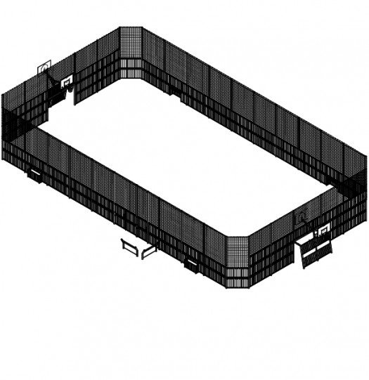 Vartai pagaminti iš karštai cinkuoto plieno ir HDPE plokštės, atsparios oro sąlygoms; Krepšiai pagaminti iš karštai cinkuoto plieno, lentos – iš HDPE;