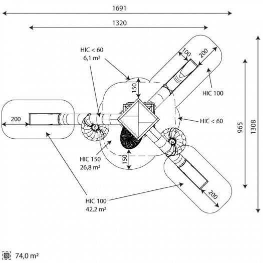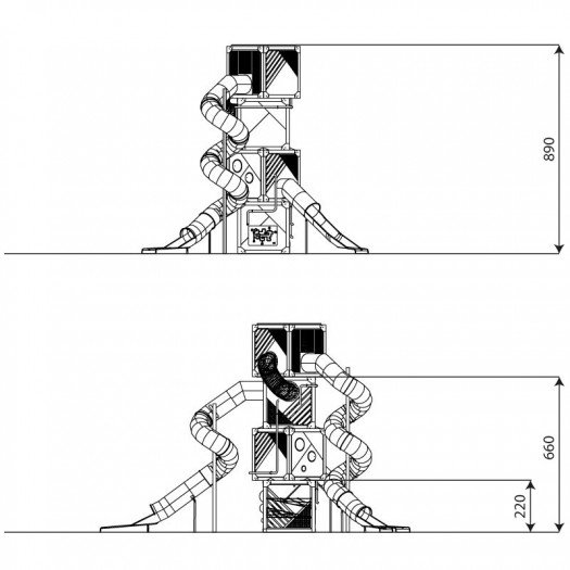 Patvari ir saugi lauko konstrukcija, pagaminta iš karštai cinkuoto ir milteliniu būdu dengto plieno bei atsparių oro sąlygoms HPL ir polikarbonato elementų. Skirta viešosioms žaidimų aikštelėms, sertifikuota pagal saugumo reikalavimus, nėra aštrių briaunų ar pavojingų tarpų. Produktas sertifikuotas pagal EN 1176-1:2017+A1:2023 standartą. Suteikiama garantija.